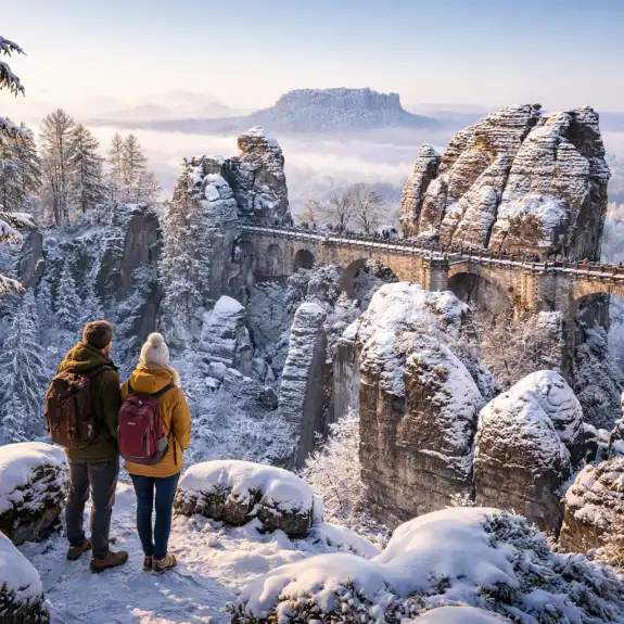 Winter transforms Bohemian & Saxon Switzerland into a peaceful world of frosted cliffs, quiet trails and dramatic viewpoints. This winter-friendly itinerary takes you to the region’s two most breathtaking all-season locations - Bastei Bridge and the Tisa Rocks labyrinth - with heated transport, a cosy lunch and an English-speaking guide. No crowds, no stress, just pure ❄ winter magic.